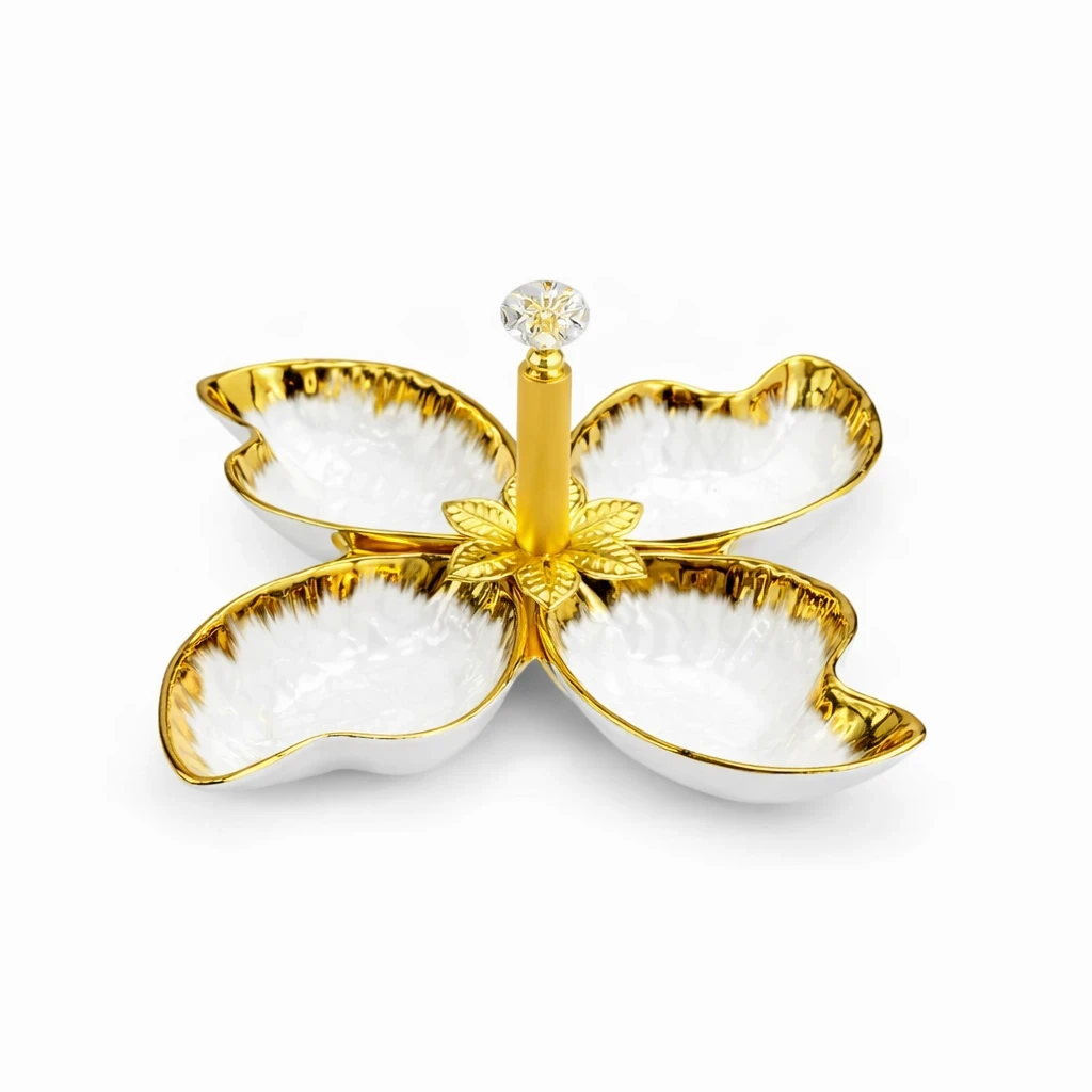 شيالة حلويات سيراميك ابيض خط ذهبي ورقة 4خ ممسك خشب