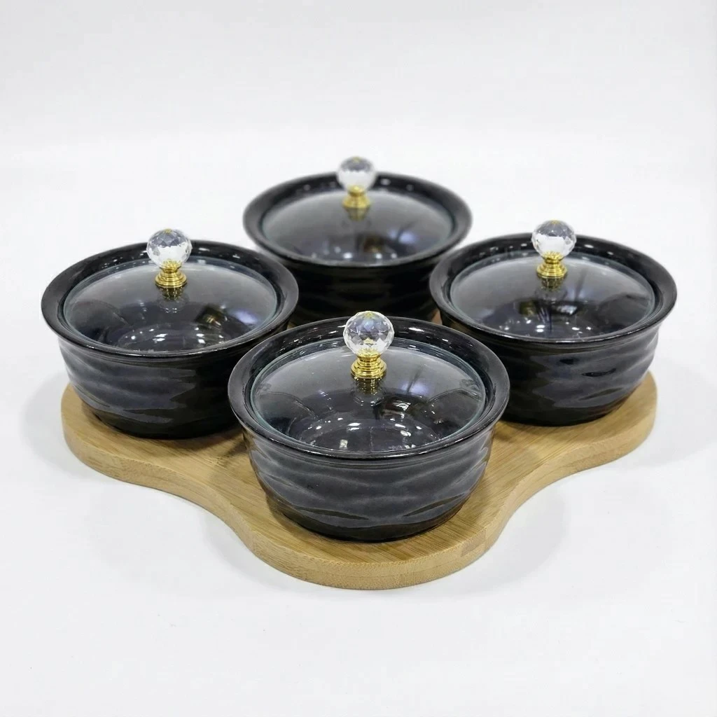 كمية شيالة حلويات سيراميك مدور 4مطائب غطاء صحن تقديم خشب